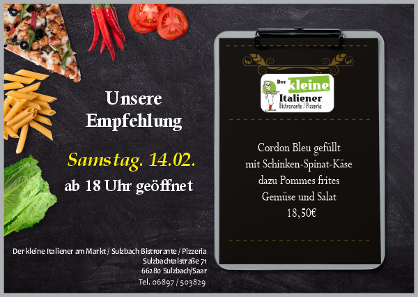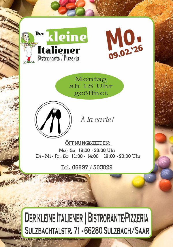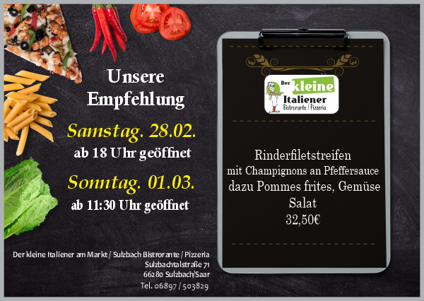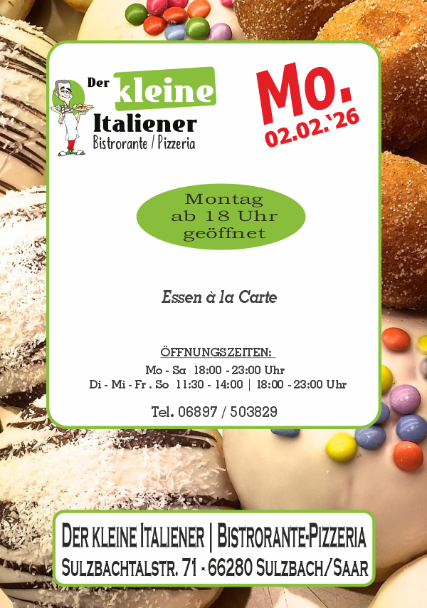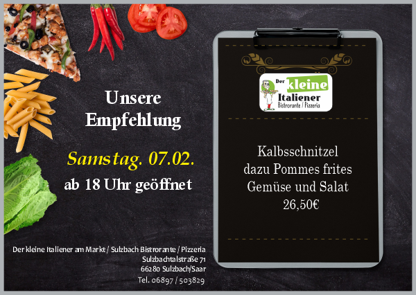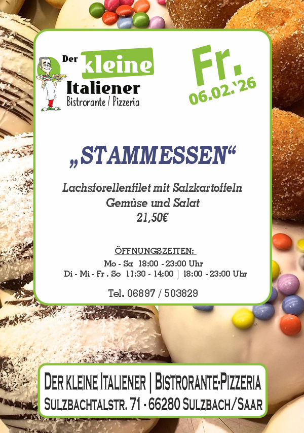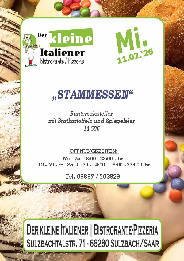 Der kleine Italiener freut sich an jedem Tag der Woche auf seine Gäste. Von Montag bis Freitag bieten wir täglich wechselnde Stammessen, mit Fleisch oder vegetarisch. Donnerstag ist Ruhetag. Auch Samstag und Sonntag gibt es neben der umfangreichen Standard-Karte ein Zusatzgericht, zum Beispiel Lammkotelett oder Kalbsleber. Zu besonderen Kalender-Anlässen lockt Salva die Gäste gerne an ein Themen-Buffet. An Fasching sind dort viele verschiedene Herings-Schmankerl zu kosten: mit Erdbeeren, mit Avocado, mit Roter Bete, mit Mango... Und im Oktober gibt es Eisbein oder Ente, Sauerkraut ist immer dabei.