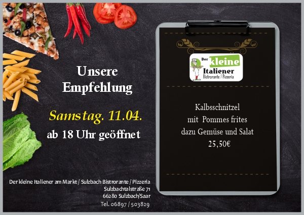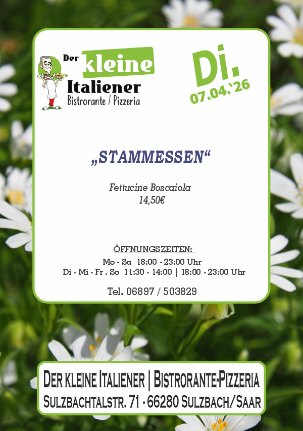 Der kleine Italiener freut sich an jedem Tag der Woche auf seine Gäste. Von Montag bis Freitag bieten wir täglich wechselnde Stammessen, mit Fleisch oder vegetarisch. Donnerstag ist Ruhetag. Auch Samstag und Sonntag gibt es neben der umfangreichen Standard-Karte ein Zusatzgericht, zum Beispiel Lammkotelett oder Kalbsleber. Zu besonderen Kalender-Anlässen lockt Salva die Gäste gerne an ein Themen-Buffet. An Fasching sind dort viele verschiedene Herings-Schmankerl zu kosten: mit Erdbeeren, mit Avocado, mit Roter Bete, mit Mango... Und im Oktober gibt es Eisbein oder Ente, Sauerkraut ist immer dabei.