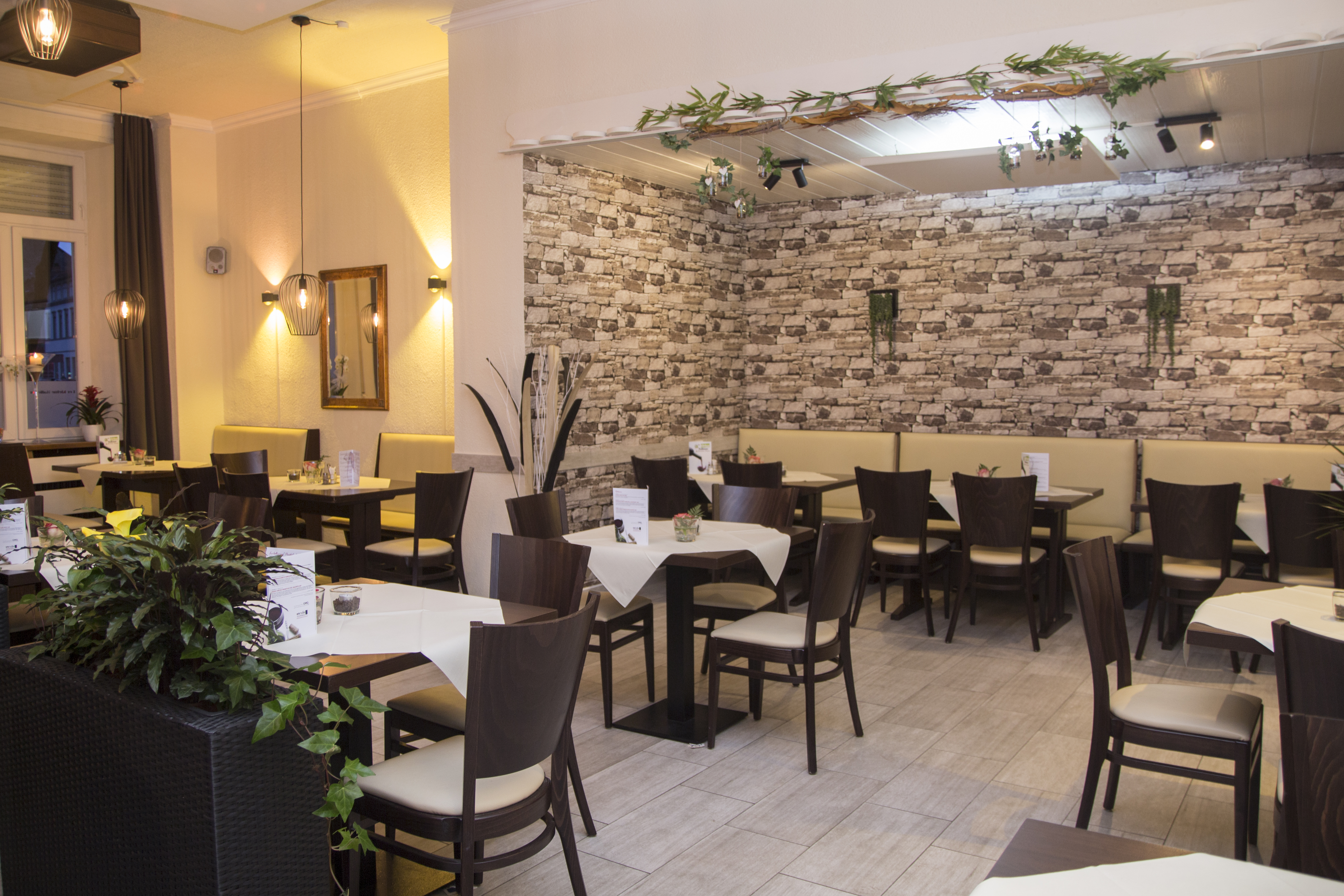 Hell und freundlich präsentiert sich der große Gastraum mit drei Sicht-Fenstern zum Markt. Die zartgelben Lederpolster der Bänke und die gleichfarbigen Tisch-Servietten sind Lichtpunkte im Mobiliar aus dunklem Holz. Zwei tischhohe begrünte Pflanzen-Bänke trennen dezent den kleinen Bar-Bereich vom Restaurant-Raum. I-Tüpfelchen ist die tiefe Raum-Nische, deren Bruchstein-Wandtapete das ganze Jahr über die sonnige Atmosphäre eines südländischen Innenhofs verströmt.